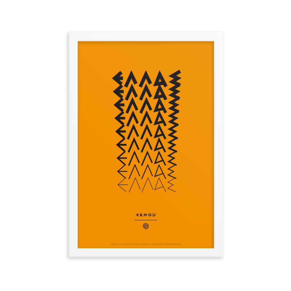 ELLAS (ΕΛΛΑΣ) means "GREECE" in Greek. Poster print is Black on a Orange background.