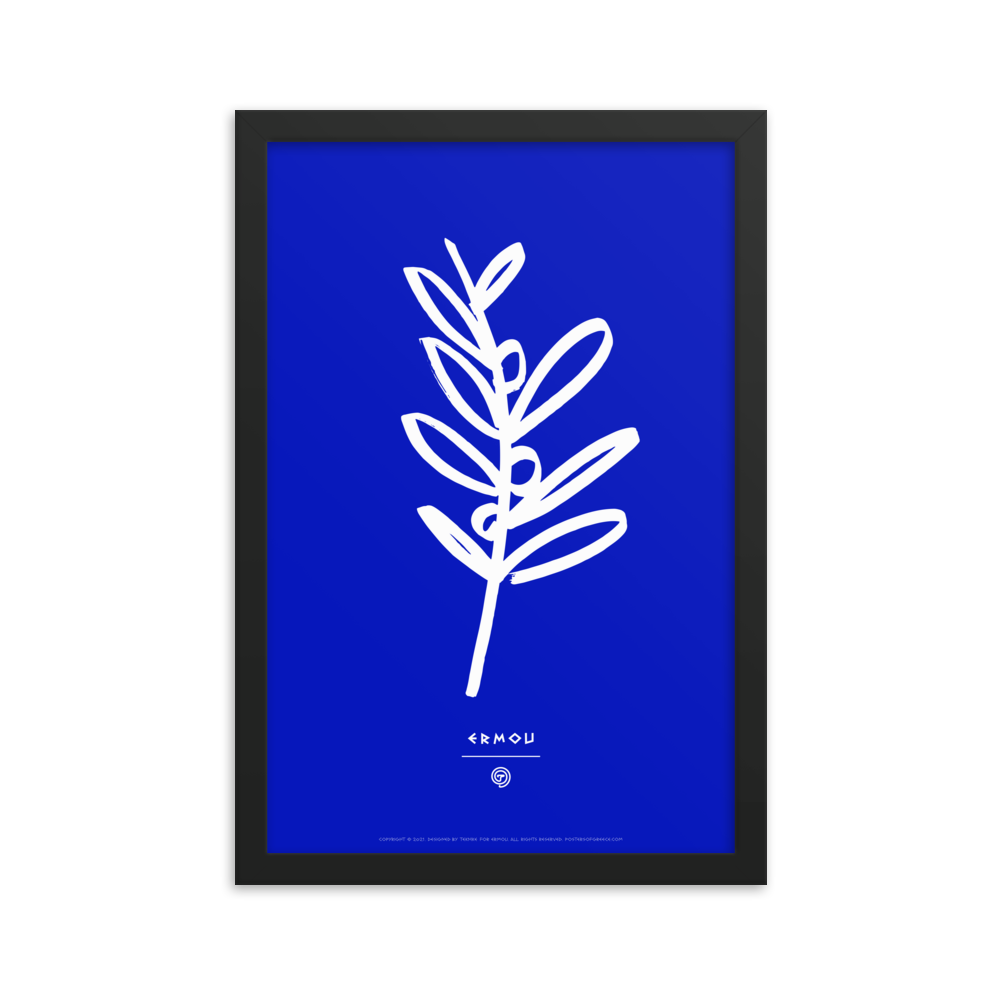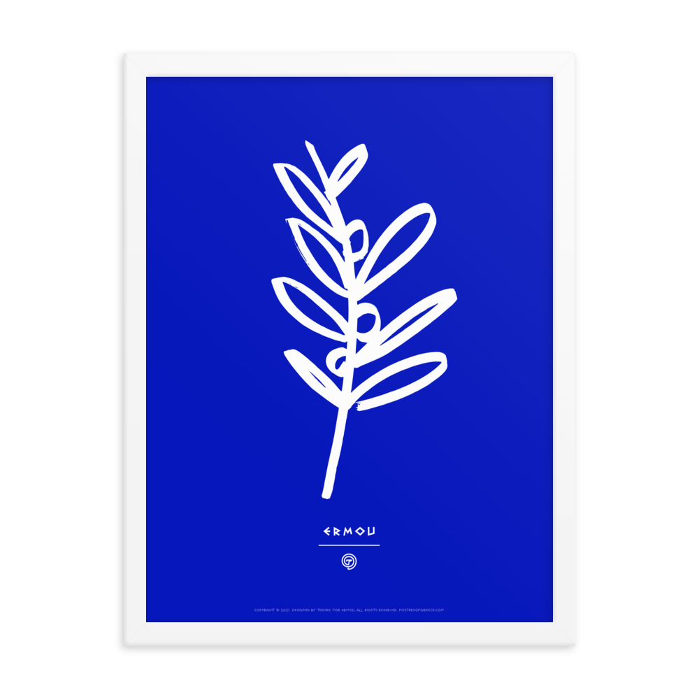OLIVE BRANCH drawing. Poster print is White on a Blue background.